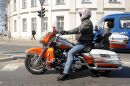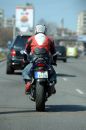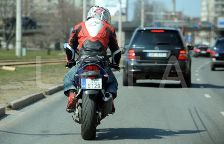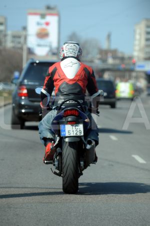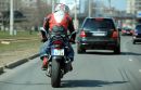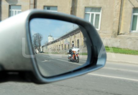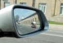 Motociklista atspulgs automašīnas spogulī Maskavas ielā.