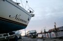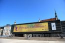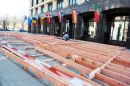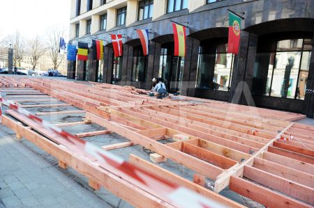 Vīrieši būvē vasaras kafejnīcu laukumā pie viesnīcas ''Hotel de ...