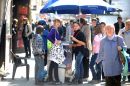 Cilvēki pie saldējumu tirgotavas Merķeļa ielā.