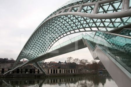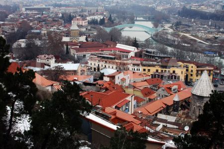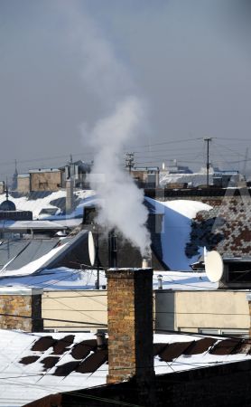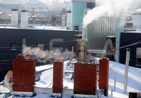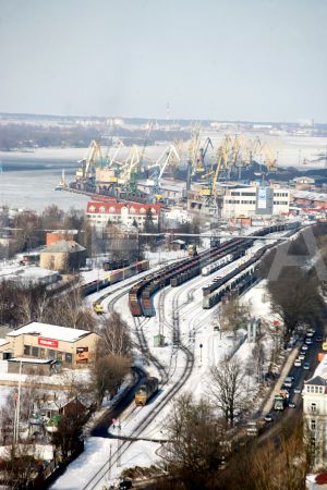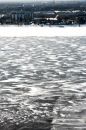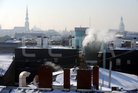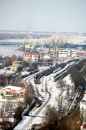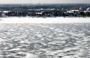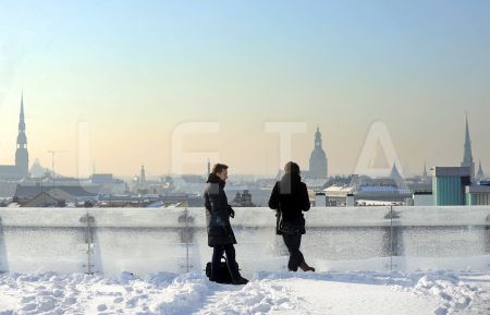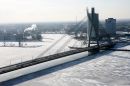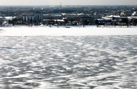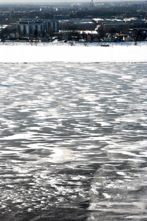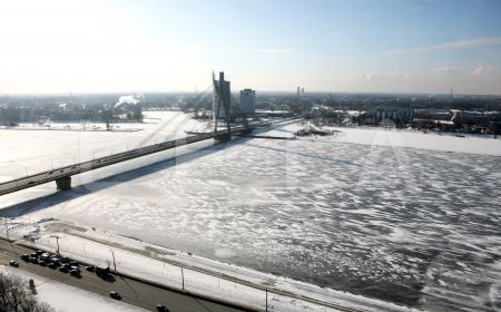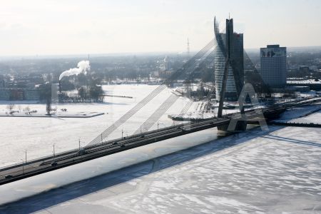 Skats uz Vanšu tiltu un aizsalušo Daugavu.