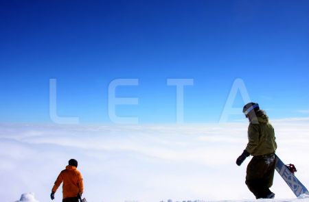 Cilvēki sauļojās kalnu slēpošanas kūrortā ''Gudauri'' Gruzijā.