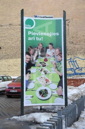 Mobilo sakaru operatora "Bite" reklāmas stabs A.Čaka ielā.