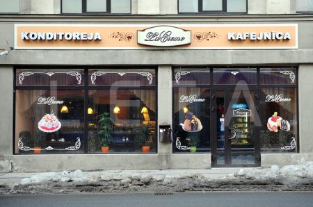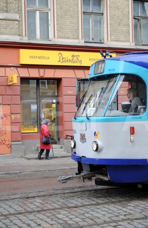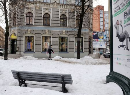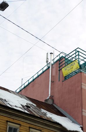 Sludinājums par telpu iznomāšanu pie mājas sienas Lāčplēša ielā.