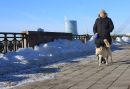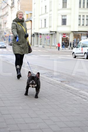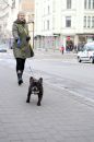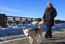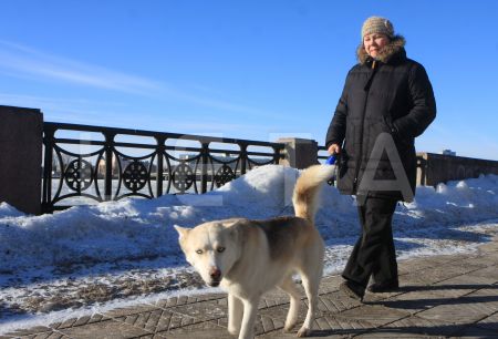 Sieviete ar suni pastaigājas 11.novembra krastmalā.