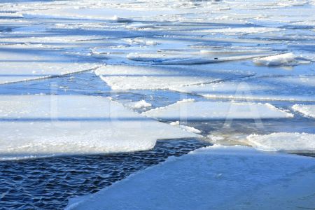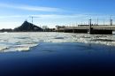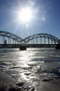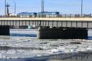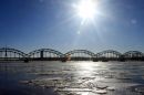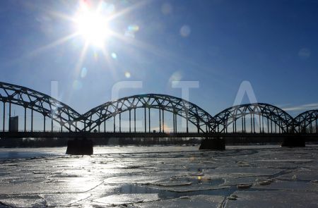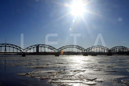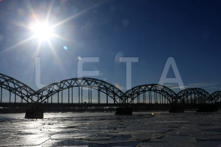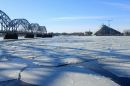 Dzelzceļa tilts un ledus gabali Daugavā.