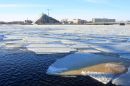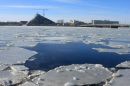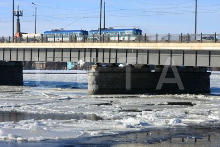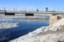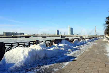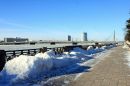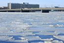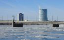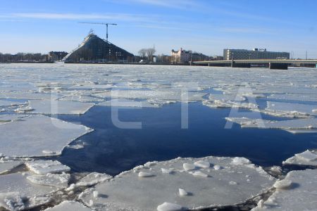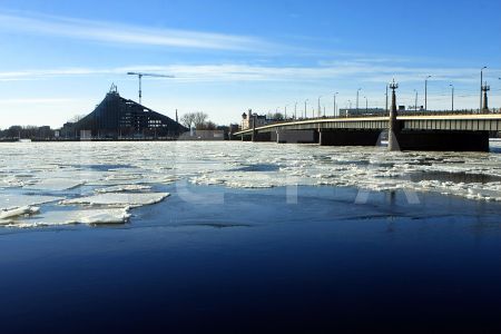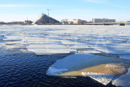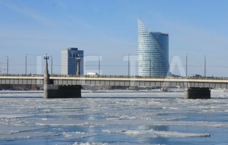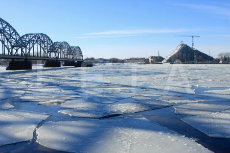 Dzelzceļa tilts, "Gaismas pils" būve un ledus gabali Daugavā.