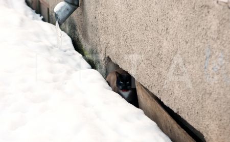 Suns un kaķis sniegā.