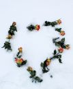 Sirds formā saliktas rozes sniegā.