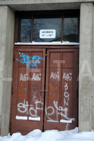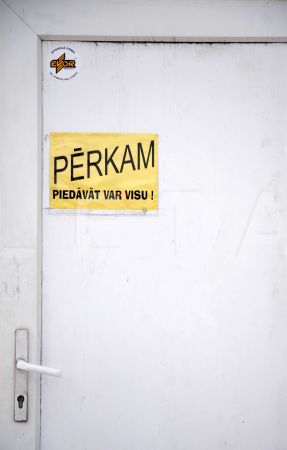 Uzraksts "Pērkam, piedāvāt var visu!" uz antikvariāta durvīm Dzirnavu ...
