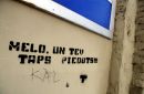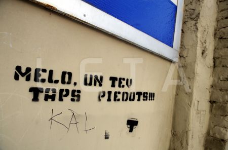 Trafarets "Melo un tev taps piedots" uz ēkas sienas Dzirnavu ielā.