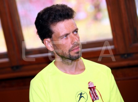Skrējējs Pēteris Cābulis piedalās preses konferencē Jāņa Akuratera ...