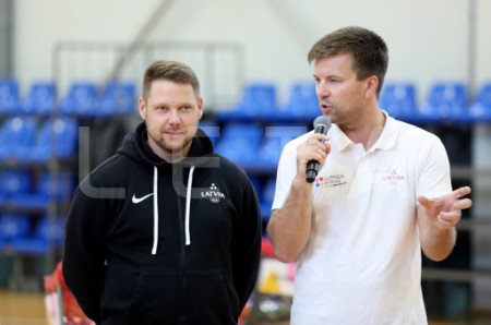 Pludmales volejbolists Jānis Šmēdiņš (no kreisās) un pasākuma ...