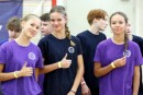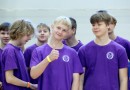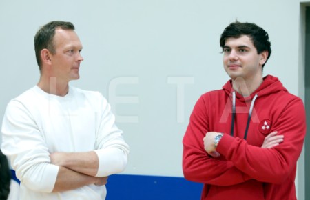 Pasākuma vadītājs Edgars Žukovskis (no kreisās) un peldētājs Daniils ...