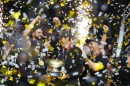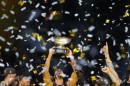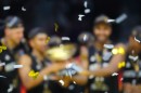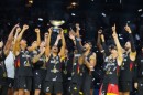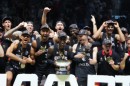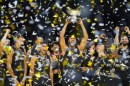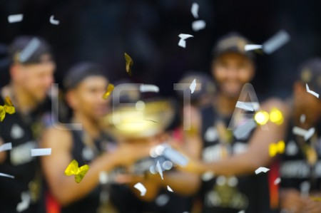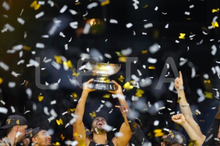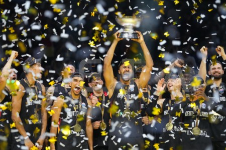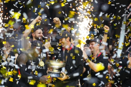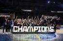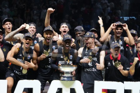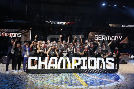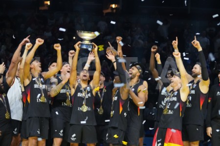Vācijas basketbola valstsvienības spēlētāji priecājas par iegūto ...
